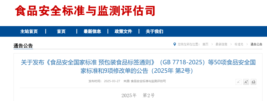 根據《食品安全法》規(guī)定,國家衛(wèi)生健康委、市場監(jiān)管總局聯合印發(fā)2025年第2號公告,發(fā)布50項新食品安全國家標準和9項修改單。主要包括:《預包裝食品標簽通則》等2項食品標簽標準、《嬰幼兒谷類輔助食品》等3項特殊膳食食品標準、《發(fā)酵乳》等4項食品產品標準、《調制肉制品生產衛(wèi)生規(guī)范》等3項生產經營規(guī)范標準、《消毒劑》1項食品相關產品標準、《食品營養(yǎng)強化劑?乙二胺四乙酸鐵鈉》等4項食品營養(yǎng)強化劑質量規(guī)格標準、《食品添加劑?葉黃素》等4項食品添加劑質量規(guī)格標準、《食品安全國家標準 食品微生物學檢驗 大腸菌群計數》等29項檢驗方法標準,以及《滅菌乳》等9項修改單。