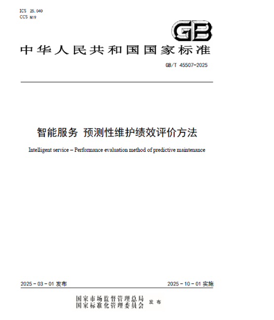GB/T45507-2025《智能服務(wù) 預(yù)測(cè)性維護(hù)績(jī)效評(píng)價(jià)方法》正式發(fā)布,將于2025年10月1日實(shí)施。該標(biāo)準(zhǔn)由儀綜所牽頭制定,由全國(guó)工業(yè)過(guò)程測(cè)量控制和自動(dòng)化標(biāo)準(zhǔn)化技術(shù)委員會(huì)(SAC/TC124)歸口。長(zhǎng)期以來(lái),績(jī)效測(cè)算是困擾預(yù)測(cè)性維護(hù)工程應(yīng)用的重要難題,“維修準(zhǔn)備時(shí)間縮短30%”、“維修工期縮短10%”、“運(yùn)維成本降低20%”等指標(biāo)缺乏統(tǒng)一量化的評(píng)估,導(dǎo)致用戶對(duì)預(yù)測(cè)性維護(hù)技術(shù)和產(chǎn)品的應(yīng)用缺乏信心。