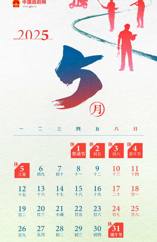 5月1日(周四)至5日(周一)放假調休,共5天。