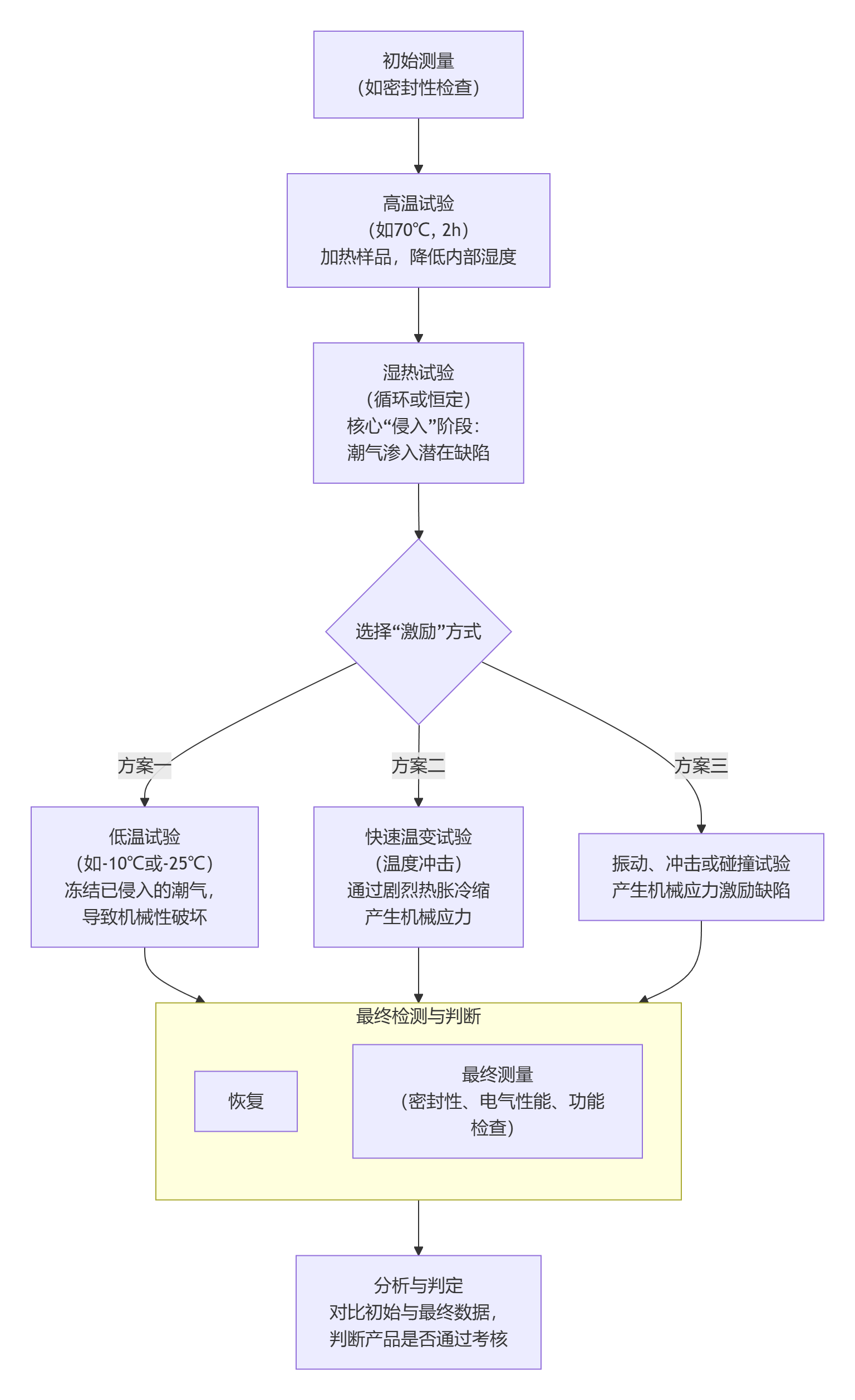激勵 (Stimulation):然后施加一種極端的機械或氣候應力(如低溫、溫度沖擊或振動),來“激勵”或“激活”這些缺陷。這個應力會使已侵入的潮氣產生物理或化學作用(如結冰膨脹、加速腐蝕),或者使缺陷擴大變得可檢測。 3.