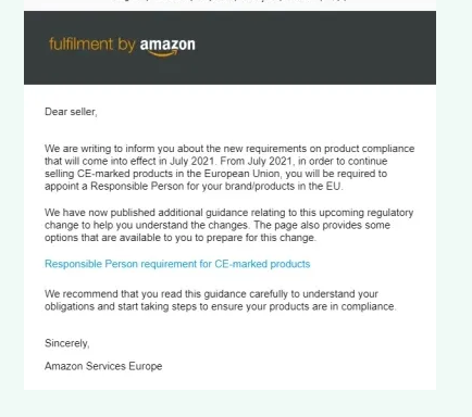 在這之前,產品只需做完CE認證,就會覺得萬事大吉了。不過現在,歐盟已有新的規則出來了:對于銷售帶有 CE 標志的商品,亞馬遜強調,必須要在 2021 年 7 月 16 號之前,確保具有位于歐盟的負責人(簡稱歐代)。