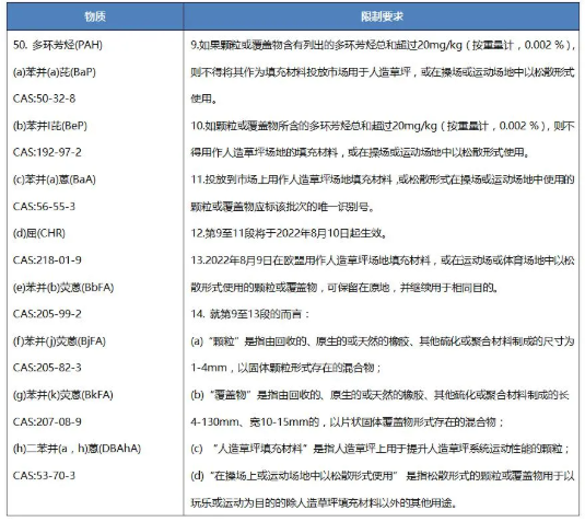 2021年7月21日,歐盟在其官方公報發(fā)布新法規(guī)(EU) 2021/1199,修訂歐盟REACH法規(guī)((EC) No 1907/2006)附件XVII第50條目,新增在人造草坪、操場或運(yùn)動場地中用作填充物的顆粒或覆蓋物中多環(huán)芳烴(PAHs)的限制。該新法規(guī)將于歐盟官方公報發(fā)布后第20天生效。