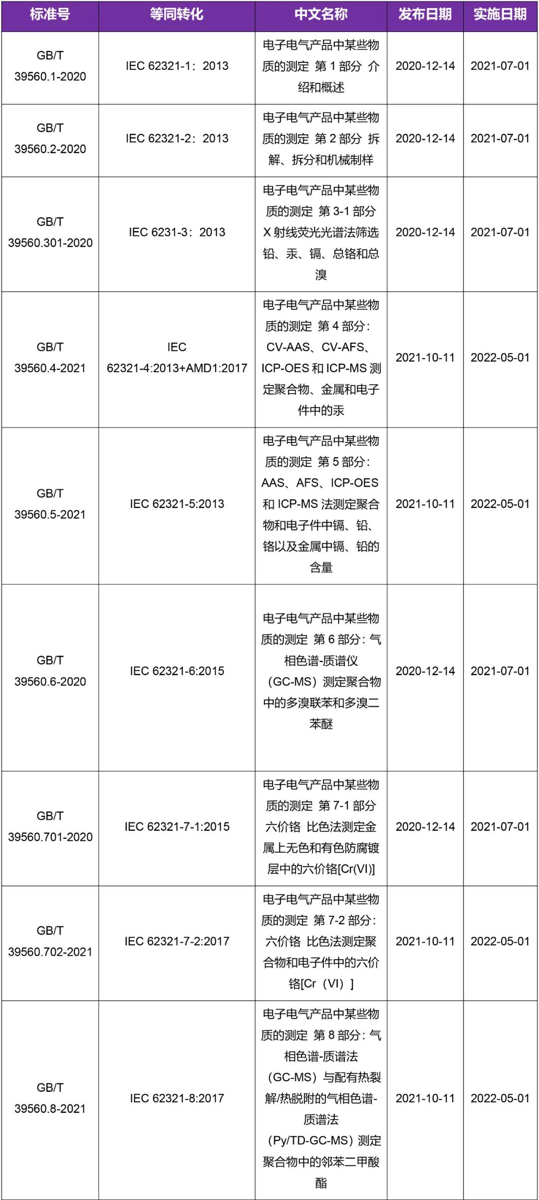 隨著電子電氣領域環保法規的加強,更多有害物質種類被限制使用,同時也出現更先進快速的新型檢測技術,而目前國內電子電氣產品RoHS檢測標準GB/T 26125:2011是等同采用IEC62321:2008(此標準已經按檢測技術和限制物質種類修訂并發布了9個系列標準)。因此,GB/T 39560系列標準應運而生,有望替代GB/T 26125成為我國《電器電子產品有害物質使用管理辦法》配套使用標準!